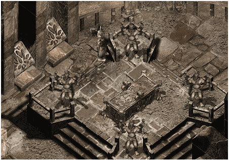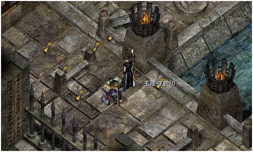 6.打败雨中客,会掉落,王陵守护印,拿到王陵守护印,在栅栏前面,就会出现雨中客的石像,点击雨中客的石像,请雨中客转至禁区,就可以进去打8大护卫了,切记进入之前要带上火炬(火炬在3层打),因为里面有4个火盆,必须用火炬丢到火盆上,把4个火盆都点燃,才可以攻击护卫武士,不然是无法打的,打败8个护卫武士之后,系统会自动将你传送至王的寝宫,里面有先辈雨中客父像,守护着一个石棺!