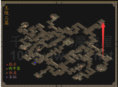 4.进入王陵3层后,按照路线图走,如遇到墙壁阻挡,只有等时间,自动开,切记不要砍,越砍越不开,跑至王陵3层右上角,入口,进入王陵迷宫(即王陵4层)